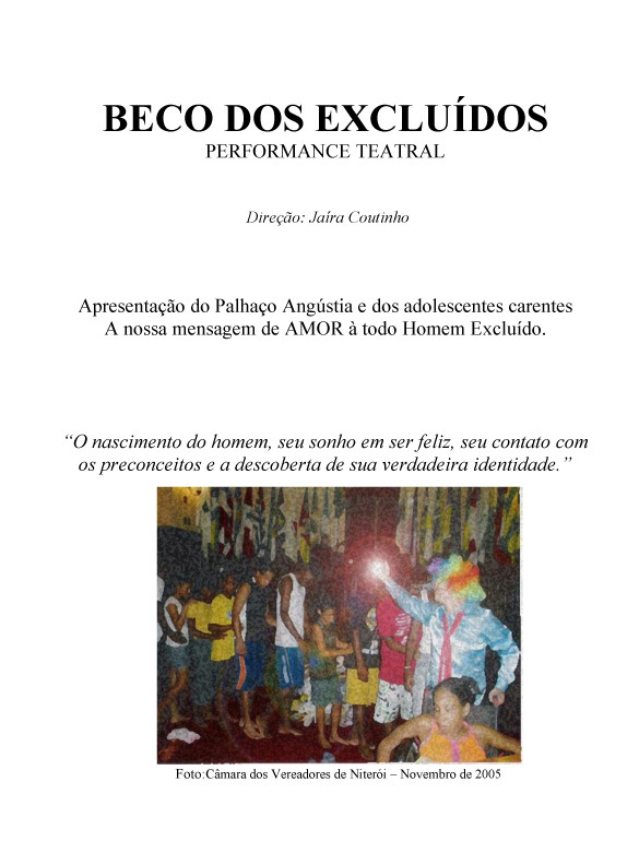 Perfomance Teatral, “BECO DOS EXCLUÍDOS”, criada a partir do Projeto AS DIFERENÇAS SOBEM AO PALCO, dirigido a adolescentes carentes, vítimas do descaso social.